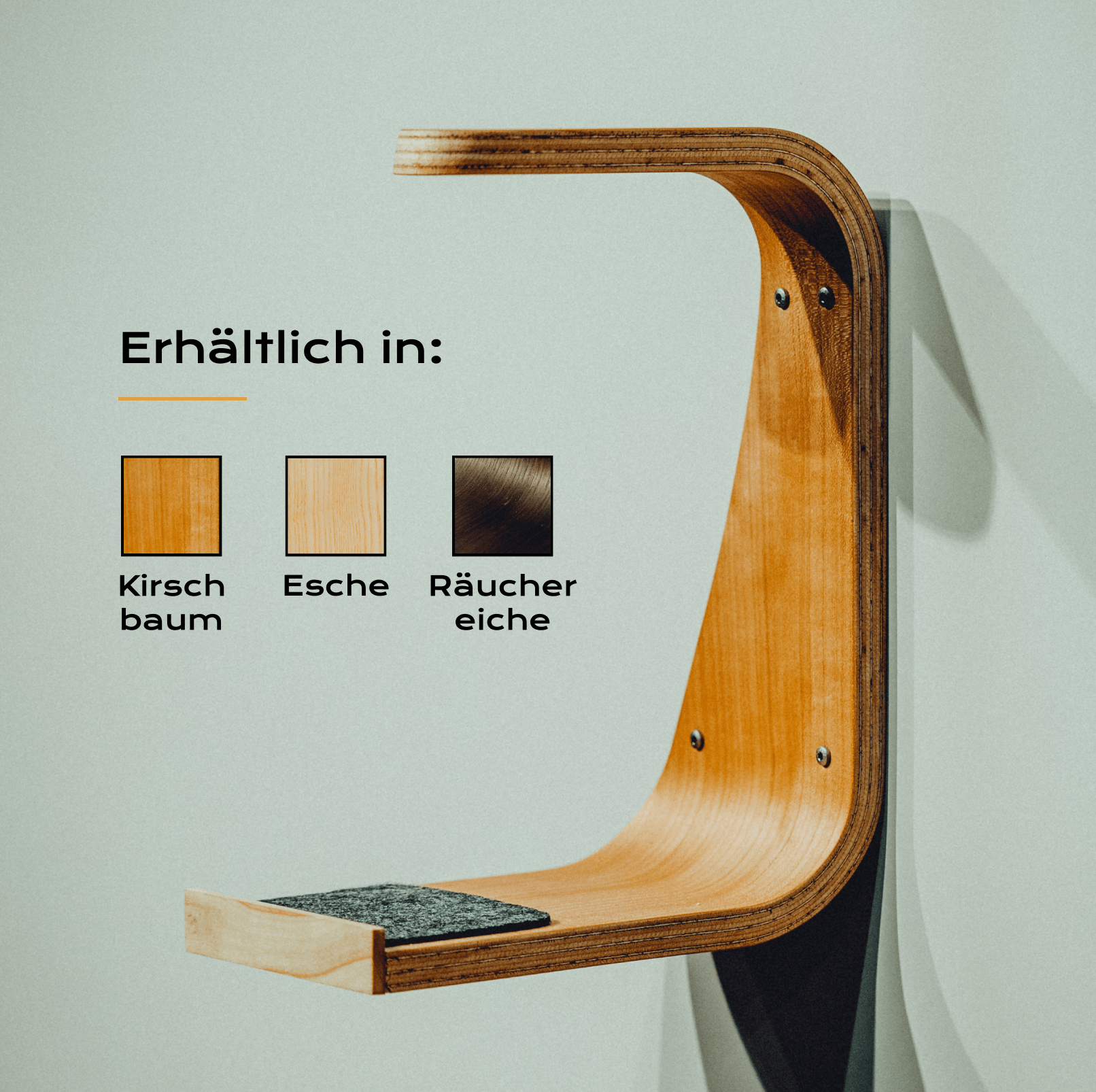 Gefertigt aus robustem Echtholzfunier, ist der Fahrradhalter nicht nur stylisch, sondern auch extrem stabil. Wir bieten Ihnen die Wahl zwischen hellem Kirschbaum, klassischer Esche und dunkler Räuchereiche. Die Konstruktion ist für Lenkerbreiten bis 46 cm ausgelegt und sorgt für eine sichere und schonende Fahrradaufhängung. So schaffen Sie Ordnung und präsentieren Ihre Leidenschaft für den Radsport stilvoll im Wohnzimmer – eine Investition in Design und Werterhalt.